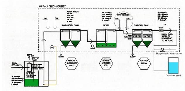 新西蘭每個(gè)擠奶房的奶牛頭數(shù)大都在400頭左右,每天沖洗水量一般為20m3左右。每天沖洗兩次,新設(shè)備主要針對(duì)每天20m3廢水開(kāi)發(fā)。